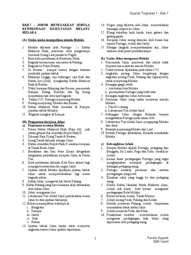 33 33 found this document useful Mark this document as useful. Nota Sejarah Tingkatan 2 - Bab 7 by Panitia Sejarah in Types School Work Study Guides Notes Quizzes. Ada hubungan persefahaman dua hala antara sultan dan pembesar memastikan kejayaan KMM 3.
